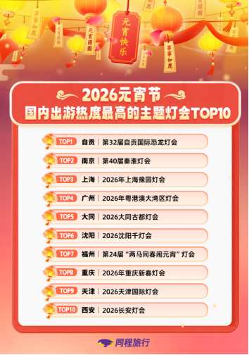 同程旅行数据显示,综合灯会搜索热度和门票预订热度,元宵节当天,国内出游热度最高的十大热门主题灯会为:第32届自贡国际恐龙灯会(自贡)、第40届秦淮灯会(南京)、2026年上海豫园灯会、2026年粤港澳大湾区灯会(广州)、2026大同古都灯会、2026沈阳千灯会、第24届“两马同春闹元宵”灯会(福州)、2026年重庆新春灯会、2026天津国际灯会、2026长安灯会(西安)。