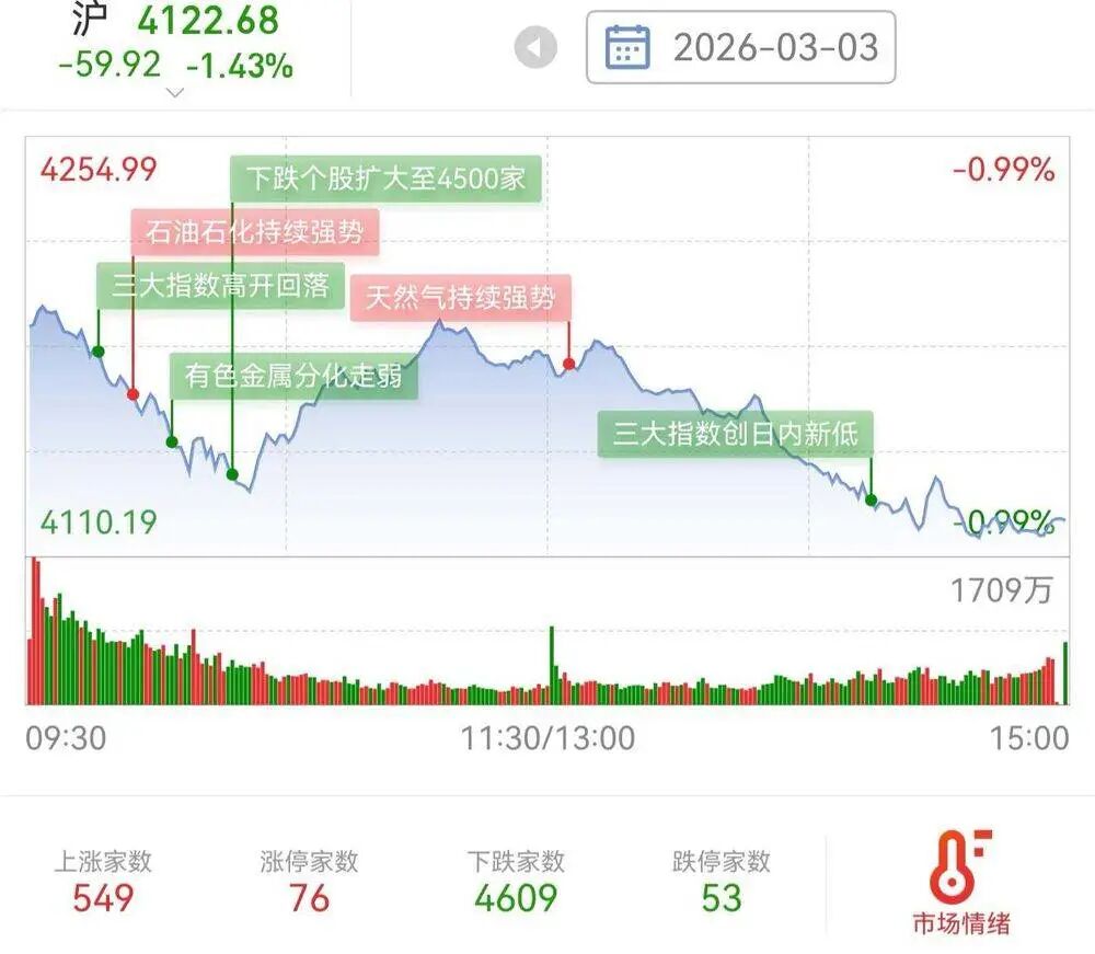 全市场下跌个股超4500家,人均跌幅4%。只有石油石化、天然气等虹吸大部分资金;商业航天、机器人、算力、AI硬件、有色金属、军工等近期热门方向纷纷回调,跌停板上还躺着53家(不包含ST股)