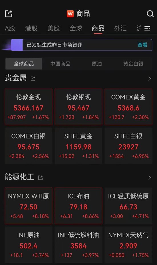 截至发稿,现货黄金涨1.67%,盘中最高触及5393美元/盎司,布油涨8.66%,美油涨8.18%。