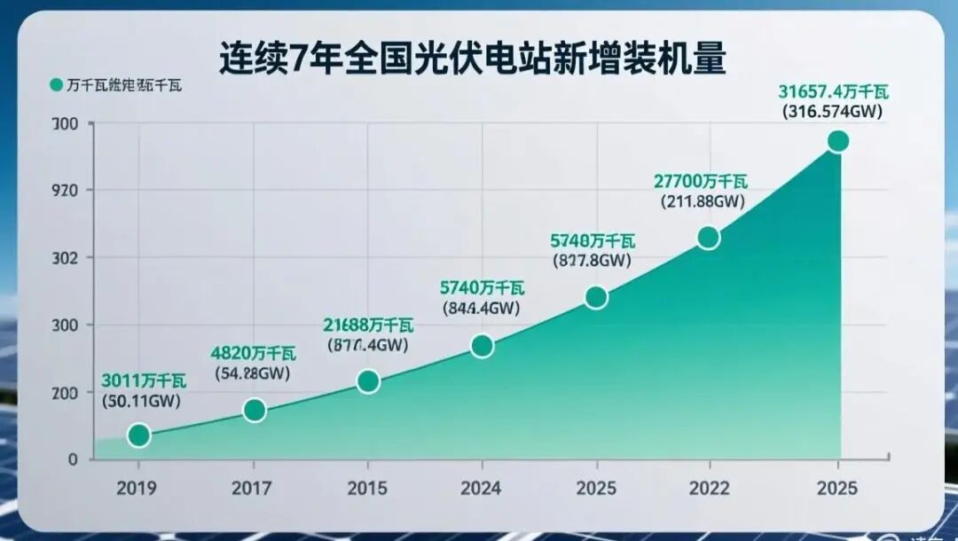 截至2025年底,全国光伏发电累计并网容量达到 119991.4 万千瓦,2025年全国光伏发电新增并网容量达到 31657.4 万千瓦,这意味着全国光伏装机规模连续7年实现爆发式增长。