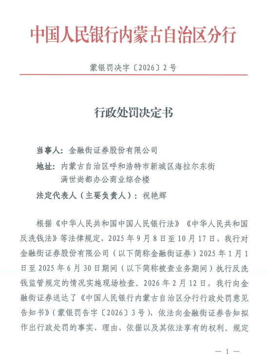 3月6日金融一线消息,据中国人民银行内蒙古自治区分行行政处罚决定书显示,金融街证券股份有限公司因未按规定制定、完善反洗钱内部控制制度规范,未按照规定开展客户尽职调查,未按照规定报告可疑交易,被给予警告,并处罚款人民币141.2万元。