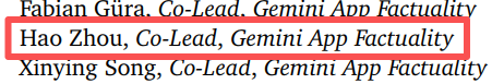 2023年,在Gemini 1.0的技术报告中,周浩担任“Gemini App Factuality Co-Lead”(Gemini APP事实性联合负责人)这一职位,他的核心职责是保障Gemini面向C端用户的输出事实准确性,输出的信息准确、可靠,不会“一本正经地胡说八道”。