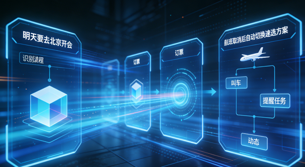 不是你问它“帮我订机票”,而是它主动在你说“明天要去北京开会”的时候,自动识别出这是一个需要订票、叫车、提醒的复合任务,并一步步帮你完成,中途遇到航班取消还能自己切换方案。