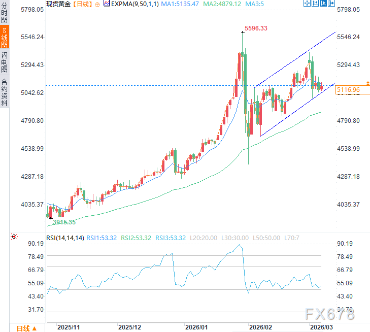日线图显示,金价维持上升通道内,正测试九日指数移动平均线(EMA)约5135美元的短期阻力。该均线趋平,显示短期动能有所减弱,但价格仍站稳上升的50日EMA(4879.12)上方,整体偏多格局未破。