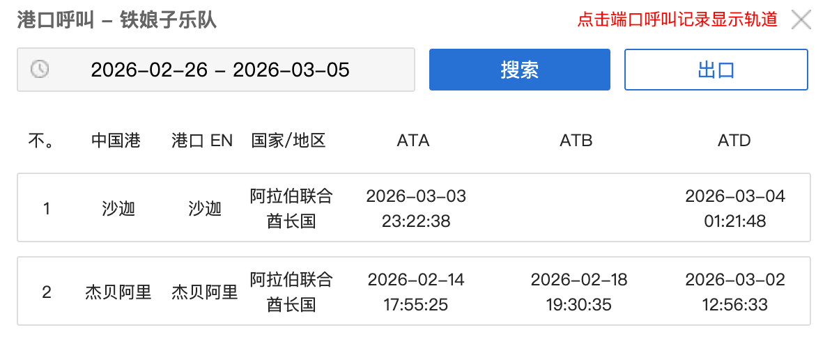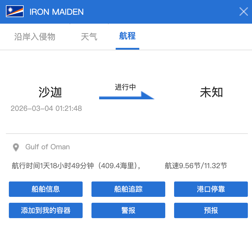 据船讯网,该船只3月2日从阿联酋杰贝阿里港驶出,在沙迦港口短暂停留两小时后,于3月4日凌晨再次驶出,最终在完成穿越后,其目的地显示为“未知”。