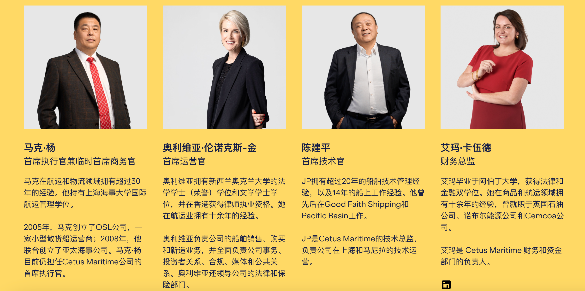 与他搭档的首席技术官陈建平,同样是华人面孔,拥有超过20年的船舶技术管理经验及14年的海上工作经验。