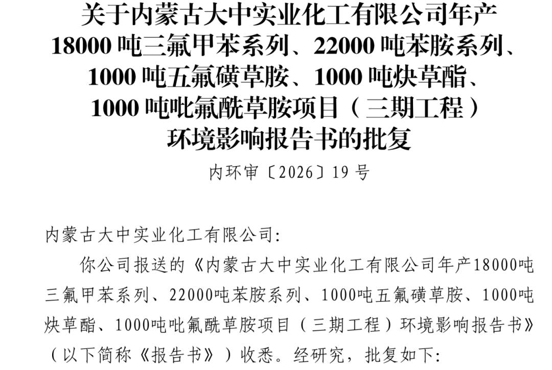 近日,关于关于内蒙古大中实业化工有限公司年产18000吨三氟甲苯系列、22000吨苯胺系列、1000吨五氟磺草胺、1000吨炔草酯、1000吨吡氟酰草胺项目(三期工程)批复公示。