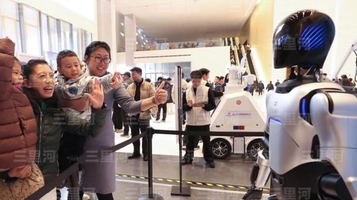 2026年2月28日,北京,家长抱着孩子在第四届北京人工智能产业创新发展大会上与机器人互动。