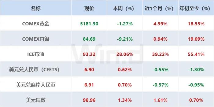 商品市场方面,贵金属呈现回调走势:COMEX黄金下跌1.27%,COMEX白银大幅下跌9.21%;国际油价飙升,ICE布油大幅上涨28.06%。