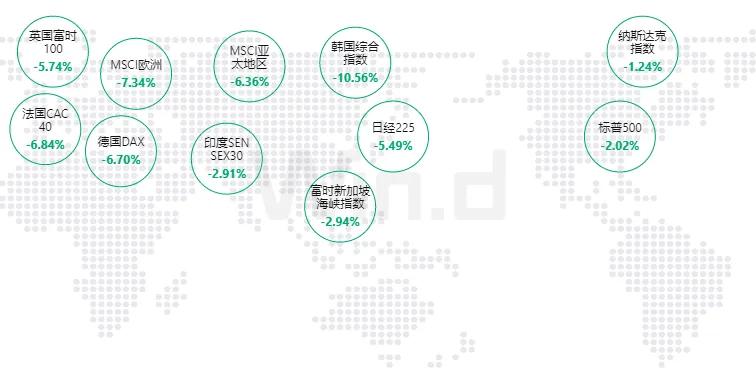 欧洲市场方面:英国富时100指数下跌5.74%,法国CAC40指数下跌6.84%,德国DAX指数下跌6.70%。