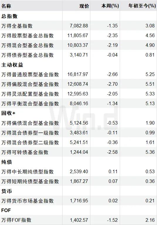 最近一周,万得基金指数整体呈现震荡回调态势。具体来看:万得全基指数下跌1.35%;万得股票型基金总指数下跌2.35%;万得混合型基金总指数下跌2.19%;万得普通股票型基金指数下跌2.66%;万得偏股混合型基金指数下跌2.70%;万得灵活配置型基金指数下跌2.05%。
