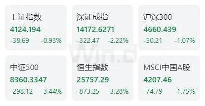 中国市场方面:上证指数下跌0.93%,深证成指下跌2.22%,沪深300指数下跌1.07%,中证500指数下跌3.44%;恒生指数表现疲软,累计下跌3.28%。