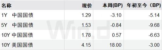最近一周,国债收益率表现分化。1年期中国国债收益率下行3.10个基点至1.29%,5年期下行0.84个基点至1.53%,10年期上行0.57个基点至1.78%。10年期美国国债收益率上行18个基点至4.15%。