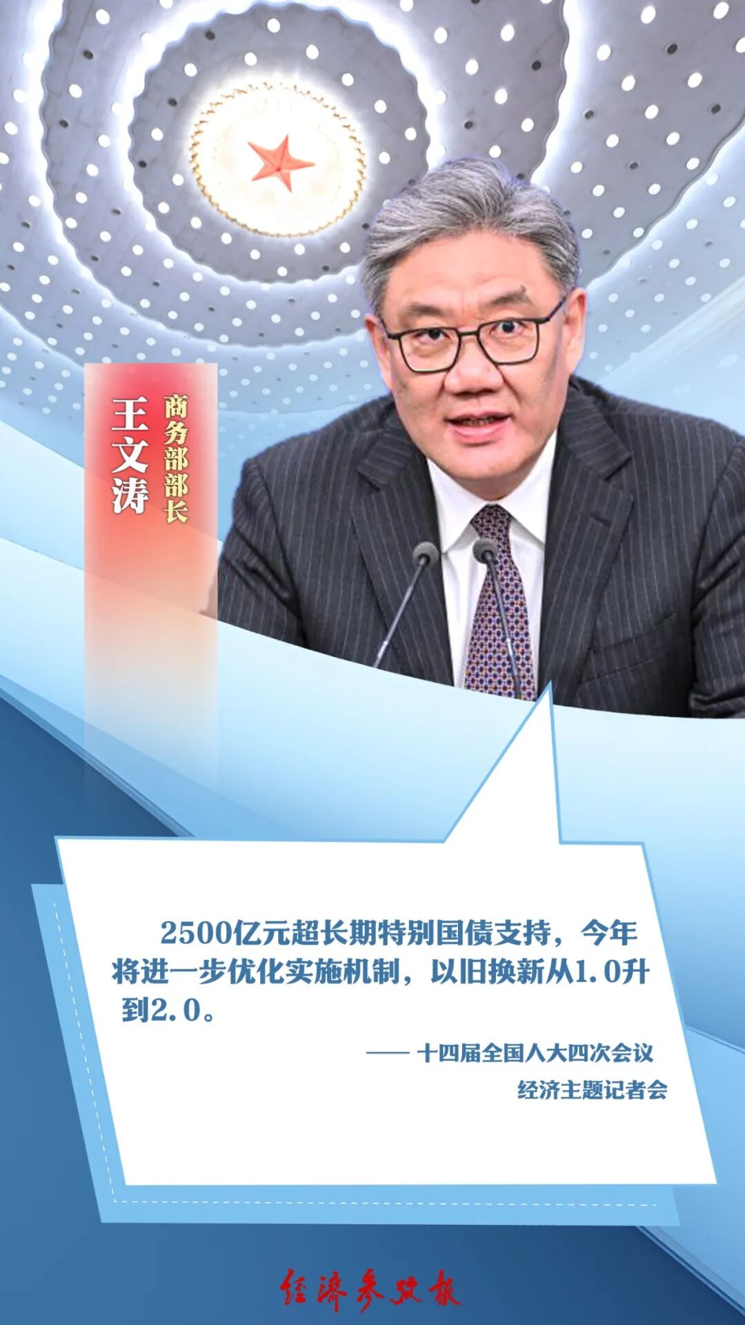 一是接续实施消费品以旧换新。政府工作报告指出,安排超长期特别国债2500亿元支持消费品以旧换新。截至目前,消费品以旧换新政策带动销售额超4.16万亿元,惠及5.31亿人次。今年我们将进一步优化实施机制,以旧换新从1.0升到2.0,重点支持两个方面:绿色智能商品和线下实体零售,为新产业、新赛道换出市场空间、增添活力。