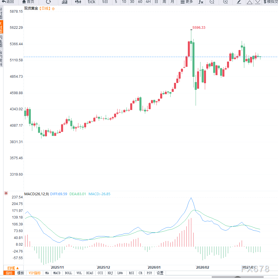 在能源市场方面,主要经济体已经尝试通过释放战略储备稳定油价。国际能源署宣布将释放4亿桶战略石油储备,这是该机构历史上规模最大的协调行动之一。同时,美国也计划释放约1.72亿桶紧急储备以缓解能源价格上涨压力。但市场普遍认为,这些措施短期内难以完全抵消供应风险,因此油价仍然保持强势。宏观经济数据方面,美国最新公布的通胀数据整体符合市场预期。2月份美国消费者价格指数(CPI)环比上涨0.3%,同比上涨2.4%。剔除食品和能源价格的核心CPI环比上涨0.2%,同比上涨2.5%。这些数据表明,美国通胀虽然较此前高位有所回落,但仍然维持在一定水平。从市场预期来看,投资者目前普遍预计美联储今年可能仅进行一次降息,远低于此前市场预期的宽松幅度。降息预期的下降使黄金失去部分利率优势,因为在高利率环境下,持有无息资产黄金的机会成本会上升。从技术面来看,黄金日线结构显示此前的上升趋势正在进入调整阶段。价格在触及阶段高位后出现连续回落,目前正在测试5100美元附近的重要支撑区域。如果该位置失守,金价可能进一步回落至5050美元甚至5000美元心理关口。上方阻力则位于5200美元和5280美元区域,这些位置此前形成明显成交密集区。从4小时图形来看,短期走势呈现震荡下行结构,均线系统开始逐渐转为平缓,显示短期多头动能有所减弱。RSI指标已经从此前的高位区域回落至中性区间,表明市场正在消化此前的大幅上涨。如果价格能够重新站稳5180美元上方,短线可能重新测试5200美元区域;但如果跌破5100美元支撑,短期回调空间可能进一步扩大。