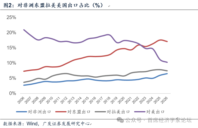 出口主要走向了哪些区域?从1-2月数据看,对非洲(同比49.9%)、东南亚(同比29.4%)、欧盟(同比27.8%)是增长最快的三个市场,其次是对俄罗斯的同比22.7%、对拉美的同比16.4%。对美国出口降幅较去年有所收窄,但依然在同比-11.0%负增长区间。其中对东盟、非洲、拉美的出口合并已经占中国出口额的31.2%,这就是我们在报告《经济温差缩小,资产叙事收敛:2026年宏观环境展望》中所提到的“南方国家工业化”,它将是中期中国制造面临的显著机遇之一。前两个月对美出口占比已进一步降至10.2%。