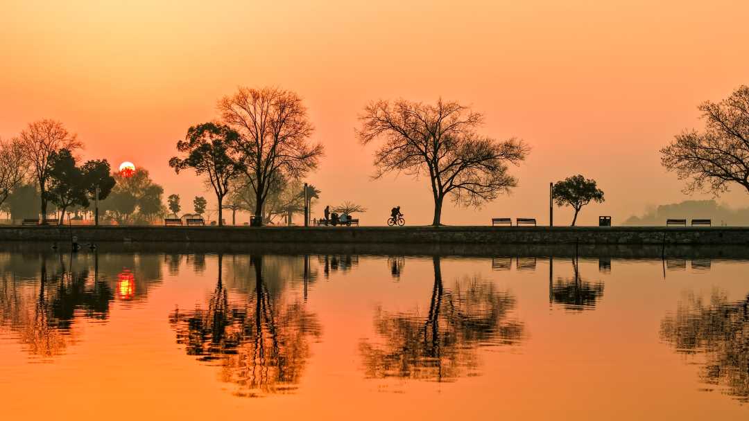 3月11日,清晨的湖北省武汉市东湖生态旅游风景区,旭日初升,水天一色。
