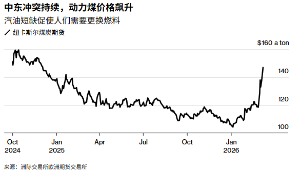 智通财经APP获悉,随着中东地区军事冲突的骤然升级,全球能源供应链正面临严峻挑战,动力煤价格受此影响已飙升至一年多以来的最高水平。本周一,亚洲基准纽卡斯尔煤炭期货价格大幅跳涨约9.3%,触及每吨150美元关口,刷新了自2024年11月以来的最高纪录;与此同时,欧洲市场反应同样剧烈,鹿特丹煤炭价格于3 月 2 日上涨约13%至每吨119.50美元,创下52周新高。