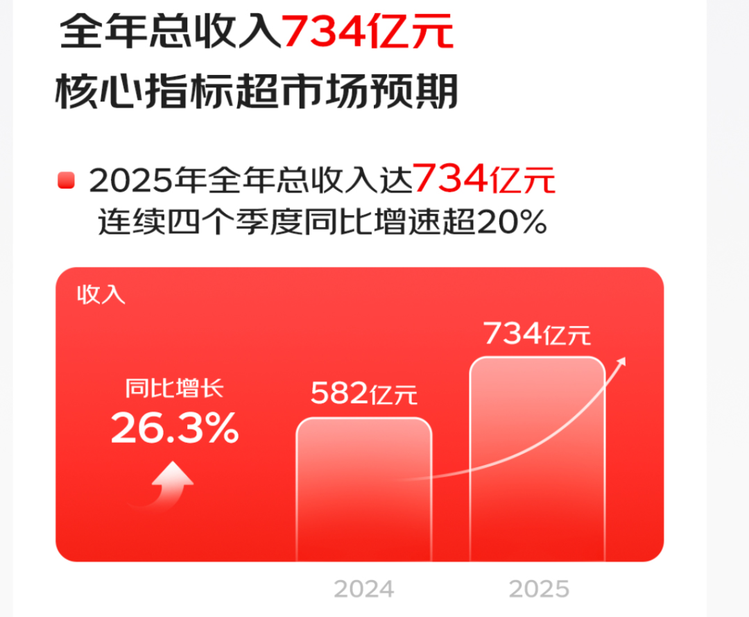 近日,京东健康2025年全年业绩公告正式披露,数据印证了增长实力:全年总收入734亿元,同比增长26.3%,且收入连续四个季度同比增速超 20%;非国际财务报告准则指标下净利润达65亿元,同比增长 36.3%,净利润率攀升至 8.9%,创下公司成立以来新高,这份公告最大的亮点,毫无疑问是AI正加快成为其业绩增长的新引擎。