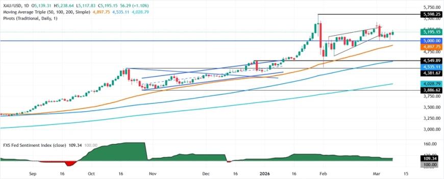 Valencia补充道,相反,如果金价跌破5150美元/盎司,第一个支撑位将是5100美元/盎司。跌破该支撑位后,金价将下探3月9日的日内低点5014美元/盎司,之后是50日简单移动平均线(SMA)4884美元/盎司。