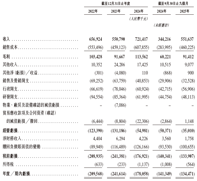 财务数据显示,在过去的2022年、2023年、2024年和2025年前九个月,凯乐士科技的营业收入分别为人民币6.57亿、5.51亿、7.21亿和5.52亿元,相应的净亏损分别为人民币2.10亿、2.42亿、1.78亿和1.34亿元。