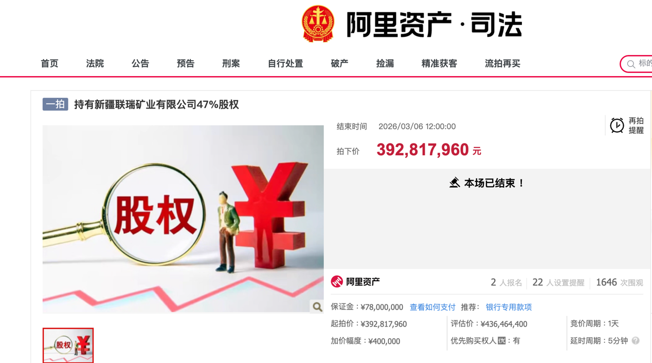 3月6日,阿里资产司法拍卖平台上,一桩评估价为4.4亿元新疆联瑞矿业有限公司(下称“联瑞矿业”)47%股权的拍品,以起拍价3.9亿元成交,在评估价格基础上打了9折。