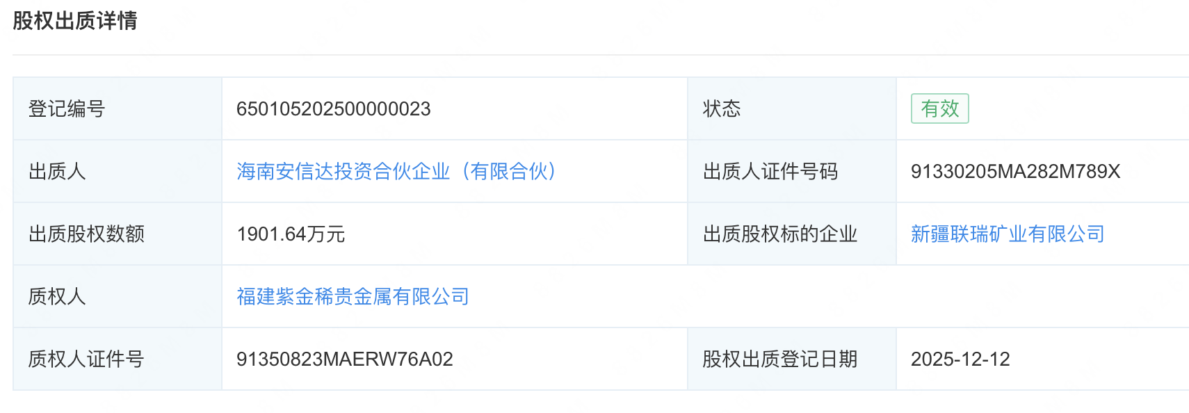 企查查显示,2025年12月,联瑞矿业的第一大股东安信达投资将所持53%股权质押,而质权人福建紫金正是紫金矿业用来竞拍联瑞矿业少数股权的子公司。