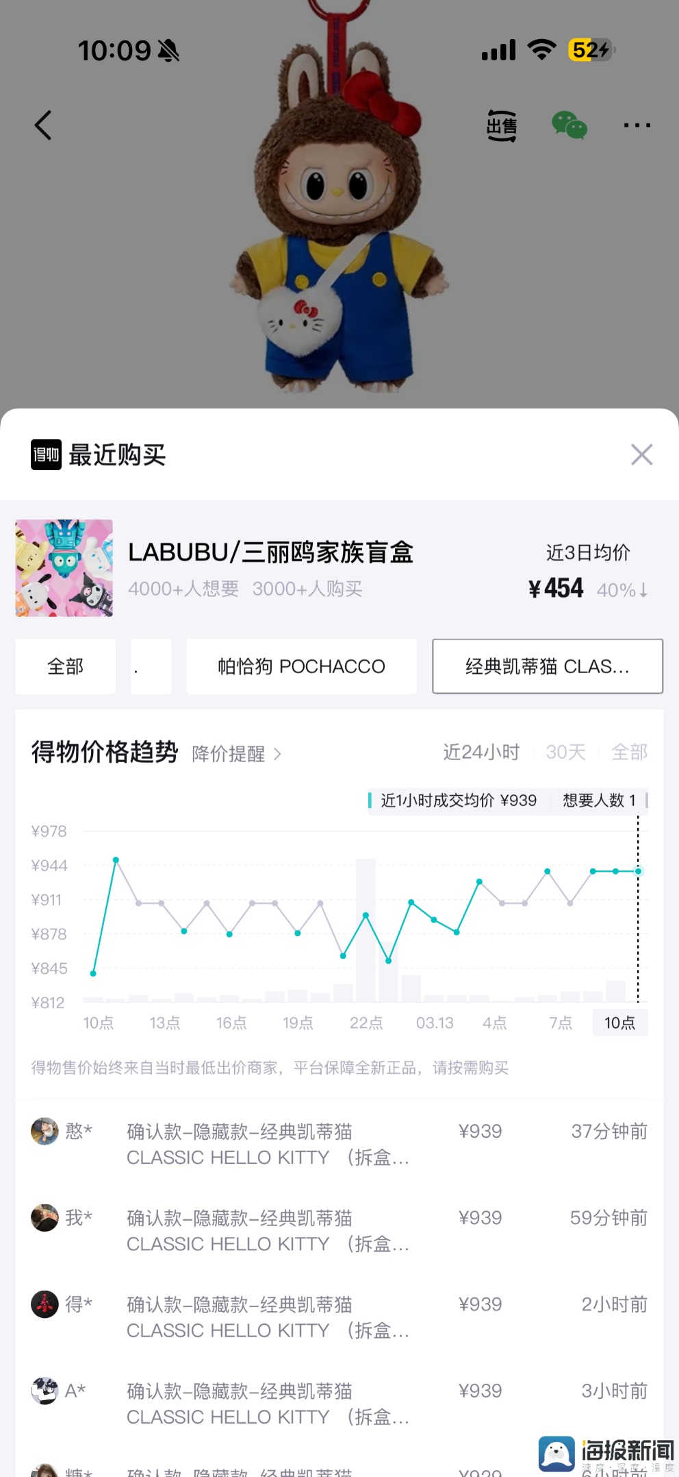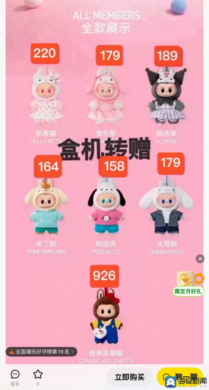 热销迅速传导至二手市场。当晚,得物、闲鱼、小红书等出现大量转售、求购帖。其中,隐藏款“经典凯蒂猫”未拆封整盒喊价超千元,“端盒保款”“预定代抢”等服务进一步推高行情。