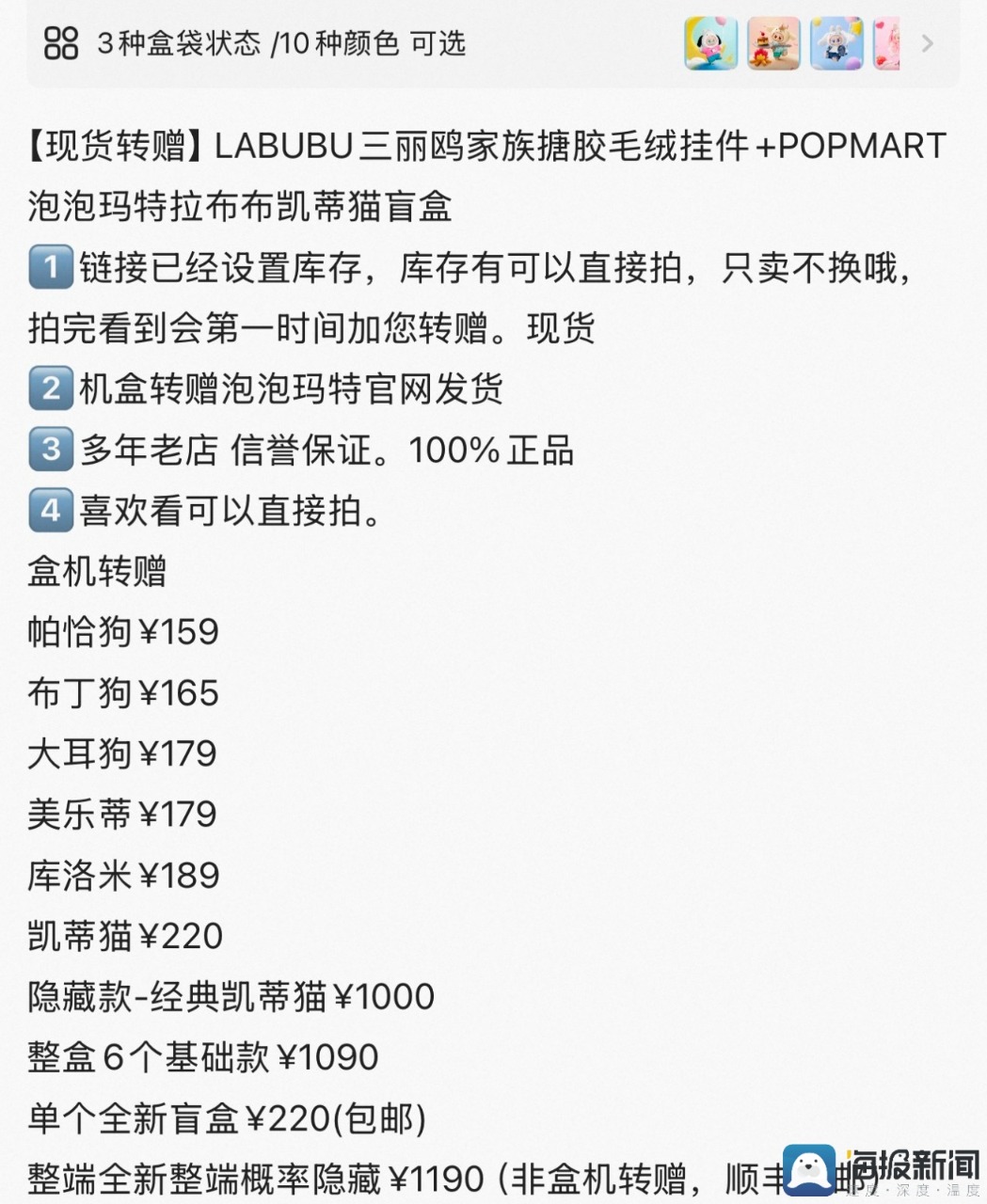 记者在闲鱼平台看到,大量卖家标注“全新未拆”“现货秒发”,部分卖家明确加价20%—50%转让,隐藏款更是成为炒作核心,有卖家标价926元转让。同时,记者发现,也有不少商家标出部分款式原价转让,“帕恰狗原价转,行情一直在掉,怕砸手里。”有卖家表示。