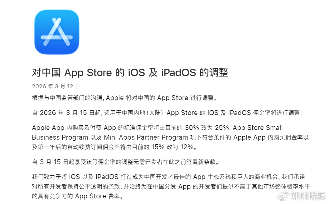 苹果公司将下调中国的应用商店(App Store)内手机及平板操作系统佣金率,标准费率从30%降至25%,小企业计划费率从15%降至12%。此次佣金率调整自2026年3月15日起施行,无需开发者重新签署条款。