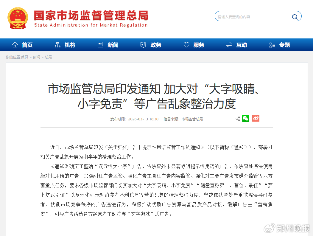 市场监管总局加大对“大字吸睛、小字免责”等广告乱象整治力度