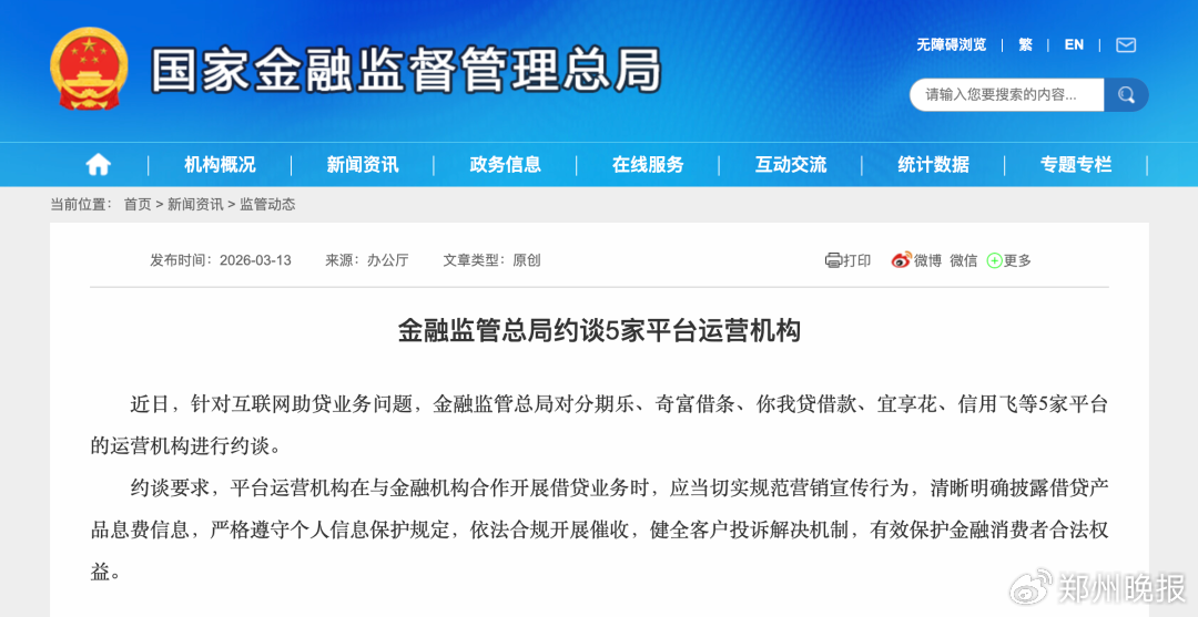 近日,针对互联网助贷业务问题,金融监管总局对分期乐、奇富借条、你我贷借款、宜享花、信用飞等5家平台的运营机构进行约谈。