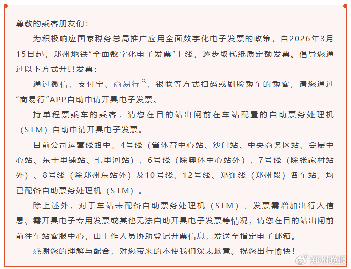 自2026年3月15日起,郑州地铁“全面数字化电子发票”上线,逐步取代纸质定额发票。