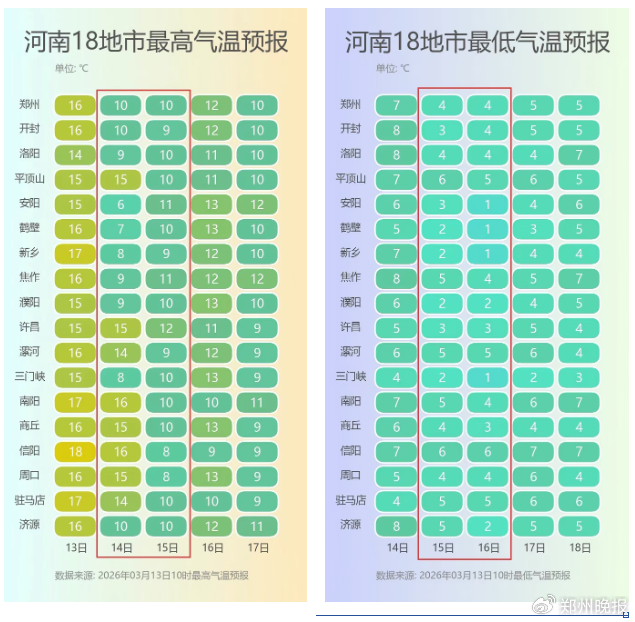 今夜起冷空气来袭,全省将迎来大范围雨雪、大风降温天气。13日下午至夜里从豫西、豫西北率先开启,以小雨为主,高海拔山区有雨夹雪;14日为主要降水时段,全省大部小雨,西部、西北部有中雨,高海拔山区雨夹雪或小到中雪;15日降水趋于结束,仅南部有小雨或零星小雨。14日全省偏北风4级左右、阵风6~7级;气温较前期下降6℃~8℃,本周末全省最高温降至10℃或以下,15日~16日大部地区最低温2℃~4℃。