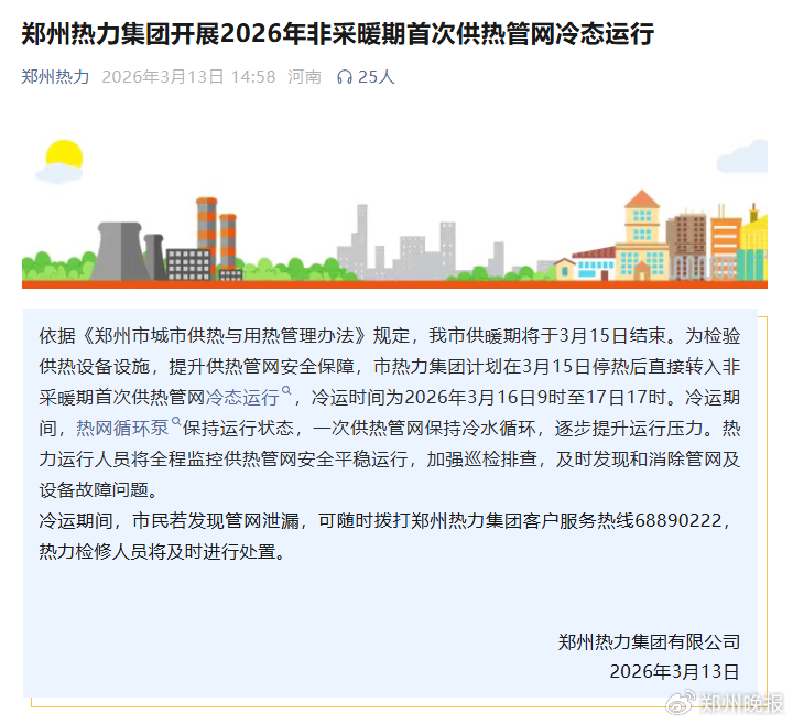 3月13日,记者从郑州热力集团获悉:依据《郑州市城市供热与用热管理办法》规定,郑州市集中供暖将于3月15日结束。
