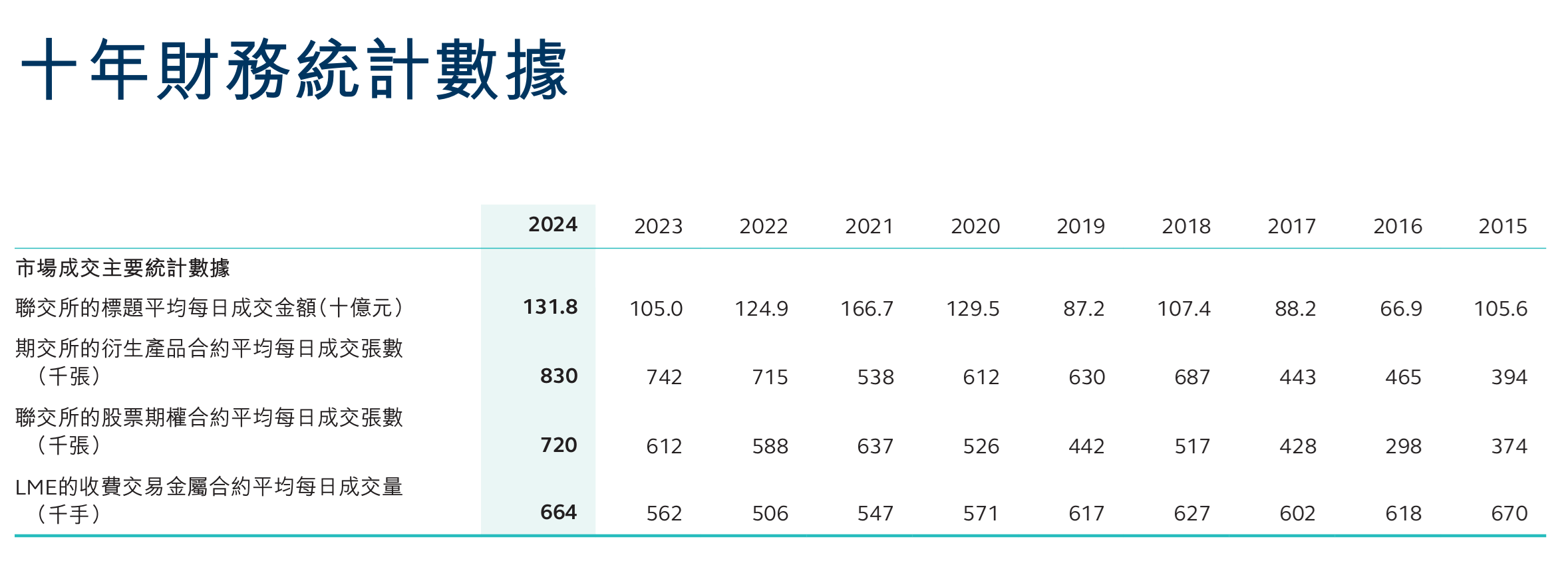 金吾财讯 | 香港交易及结算所有限公司 HONG KONG EXCHANGES AND CLEARING LTD. 股票代号:00388市盈率:29倍每股盈利:$14.1市值:$5100亿业务类别:金融证券主要股东:The Government of the Hong Kong Special Administrative Region(Exchange Fund)(5.90%)5年业绩年度:2021/2022/2023/2024/2025收益(亿):195/169/154/173/237盈利(亿):125/101/119/131/178每股盈利:9.91/7.96/9.37/10.3/14.1每股派息:8.87/7.14/8.41/9.26/12.5ROE:25.4/20.3/23.4/24.8/31.7--企业简介--