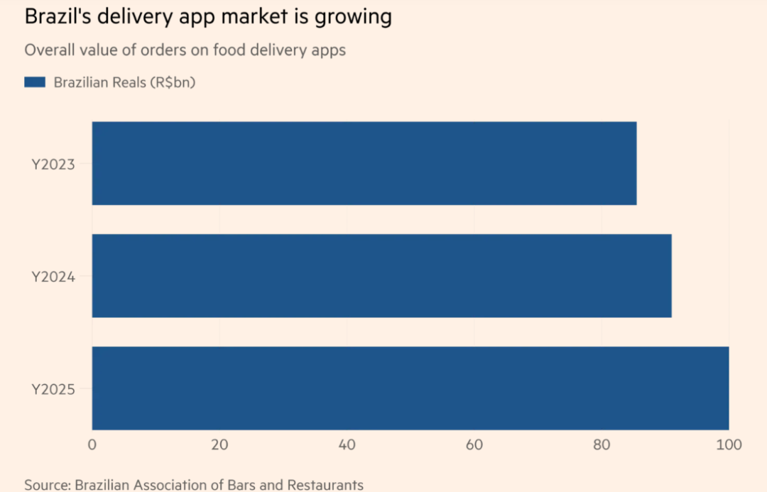 据巴西酒吧和餐厅协会估计,到2025年,通过外卖应用程序完成的订单总额预计将达到1000亿雷亚尔,高于前一年的910亿雷亚尔。