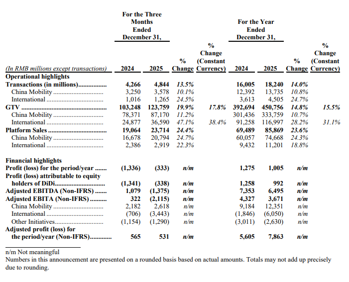 2025年第四季度,滴滴核心平台(中国出行与国际业务)的销售额达到237亿元,同比增长24.4%;全年销售额达到859亿元,同比增长23.6%。