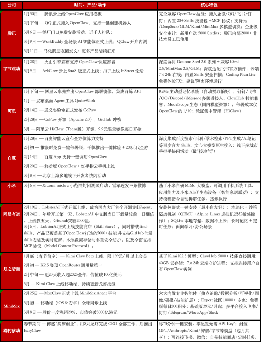 第一,时间窗口极度压缩。从2月下旬到3月上旬,不到三周时间,十几家公司几乎同时完成了“产品发布—云端部署—线下推广”的全套动作。
