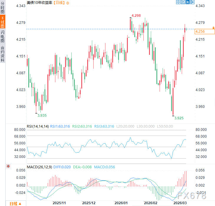 (美债10年收益率日线图,来源:易汇通)北京时间10:31,美债10年收益率现报4.26%。
