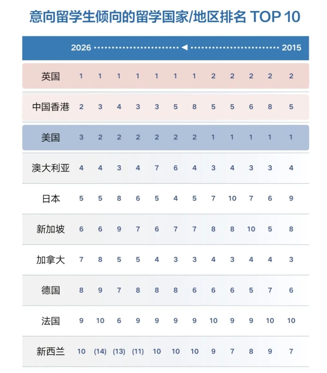 近年来,受全球地缘政治紧张局势加剧、国际秩序不确定性增加、英美留学成本攀升等因素影响,中国香港在中国留学生意向目的地的排位持续上升。《报告》显示,中国香港目前已经超过美国,成为仅次于英国的第二位。马来西亚、泰国等东南亚地区也因地理位置相近、时差小、花费较低,成为许多留学生“就近留学”的选择。