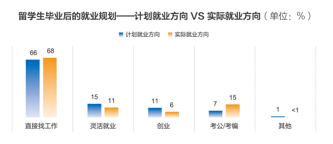 《报告》同样揭示了这一趋势:留学的“职业导向性”日益凸显,规划更贴合未来深造与就业核心需求。《报告》还指出,当前海归们在就业上,倾向于稳定性、确定性更高的岗位。在最新的留学毕业生中,“考公/考编”的实际比例达15%,显著高于计划阶段的7%,而“创业”与“灵活就业”的实际比例均低于计划值。