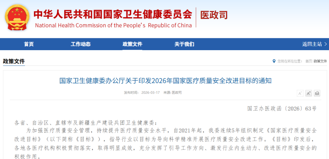 3月17日,国家卫健委医政司发布《关于印发2026年国家医疗质量安全改进目标的通知》,确定检验科2026年两大重点任务。