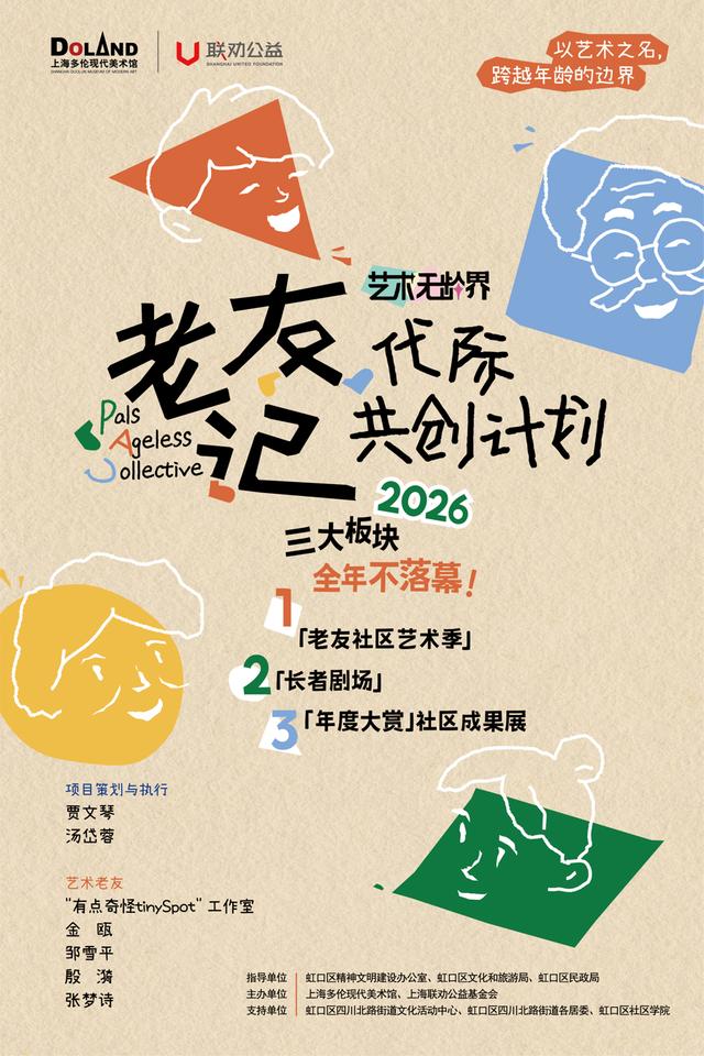 随着社会老龄化进程加快,如何让不同年龄段的人群在艺术实践中相遇、相知,已成为城市公共文化空间的重要课题。在此背景下,上海多伦现代美术馆与上海联劝公益基金会携手,正式推出“艺术无龄界”老友记代际共创计划。活动由虹口区精神文明建设办公室、虹口区文化和旅游局、虹口区民政局指导,2026年3月至2027年1月在虹口区全面展开。