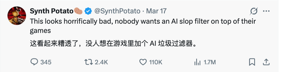 尽管官方和游戏方都在大力吹捧DLSS 5,但网友们丝毫不买账。