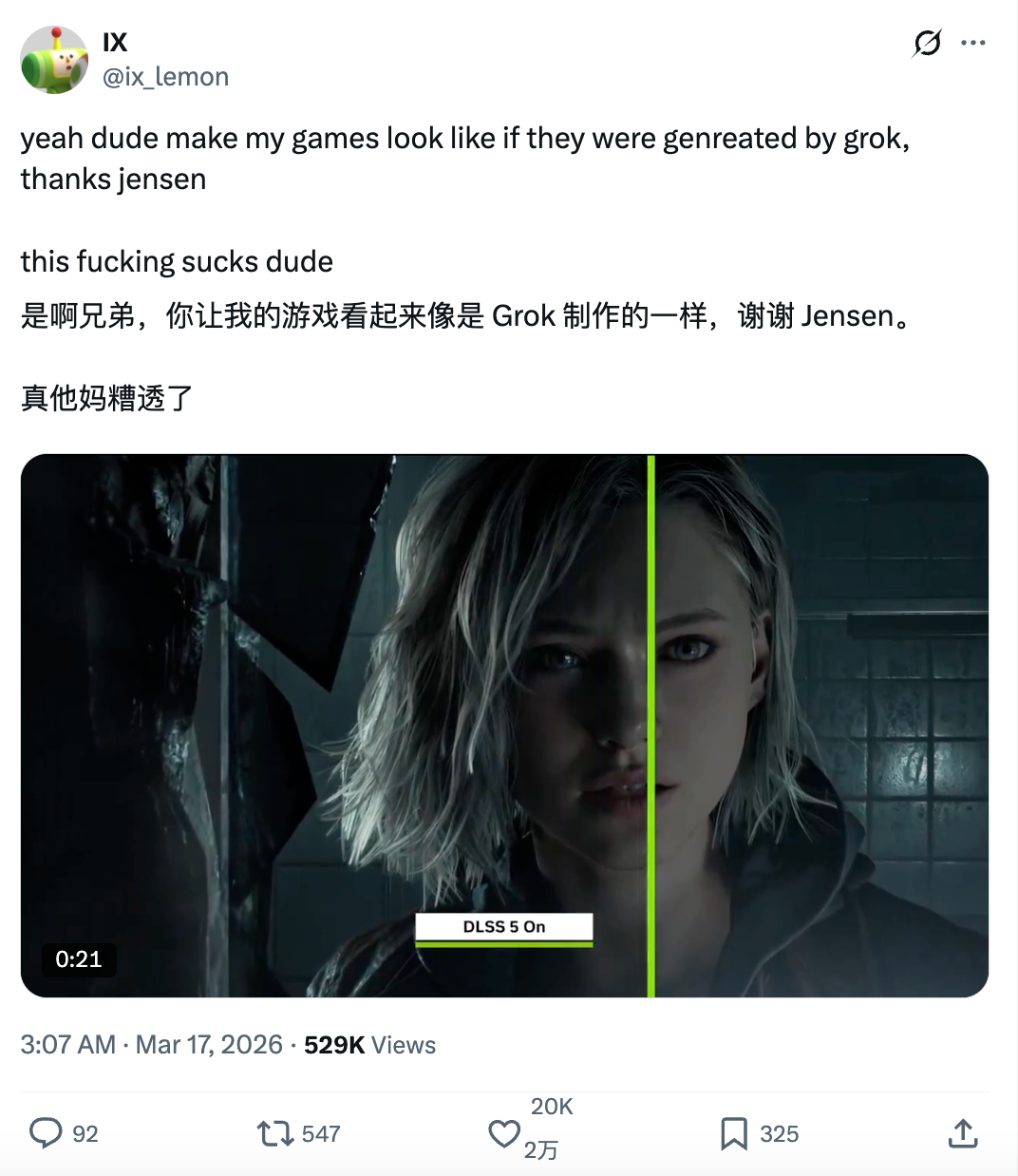 原因是周一英伟达刚发布新一代图形技术DLSS 5,本该是一次“性能革命”,结果却遭到了游戏圈集体抵制。