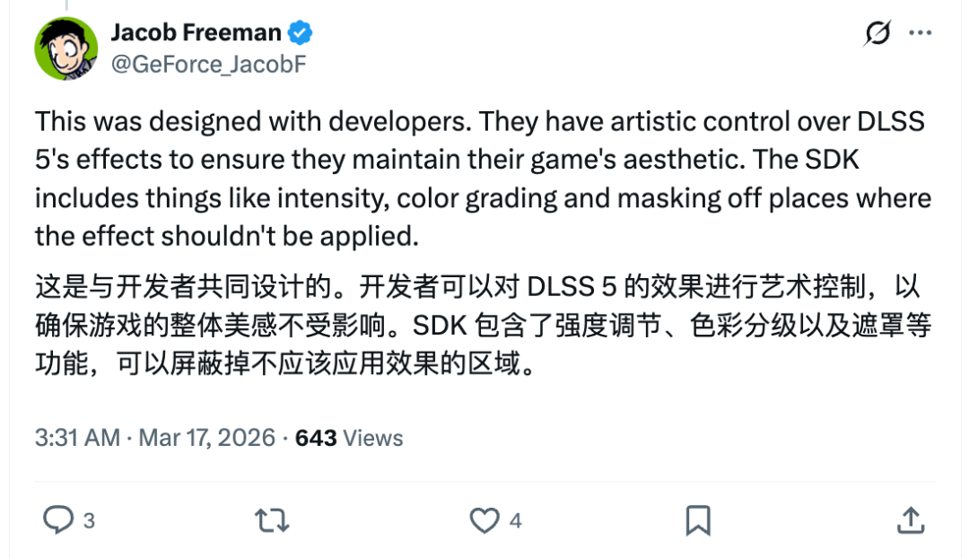 英伟达的布道师雅各布·弗里曼也出来强调,开发者“可以对 DLSS 5 的效果进行艺术控制,以确保游戏的视觉美感不受影响”。