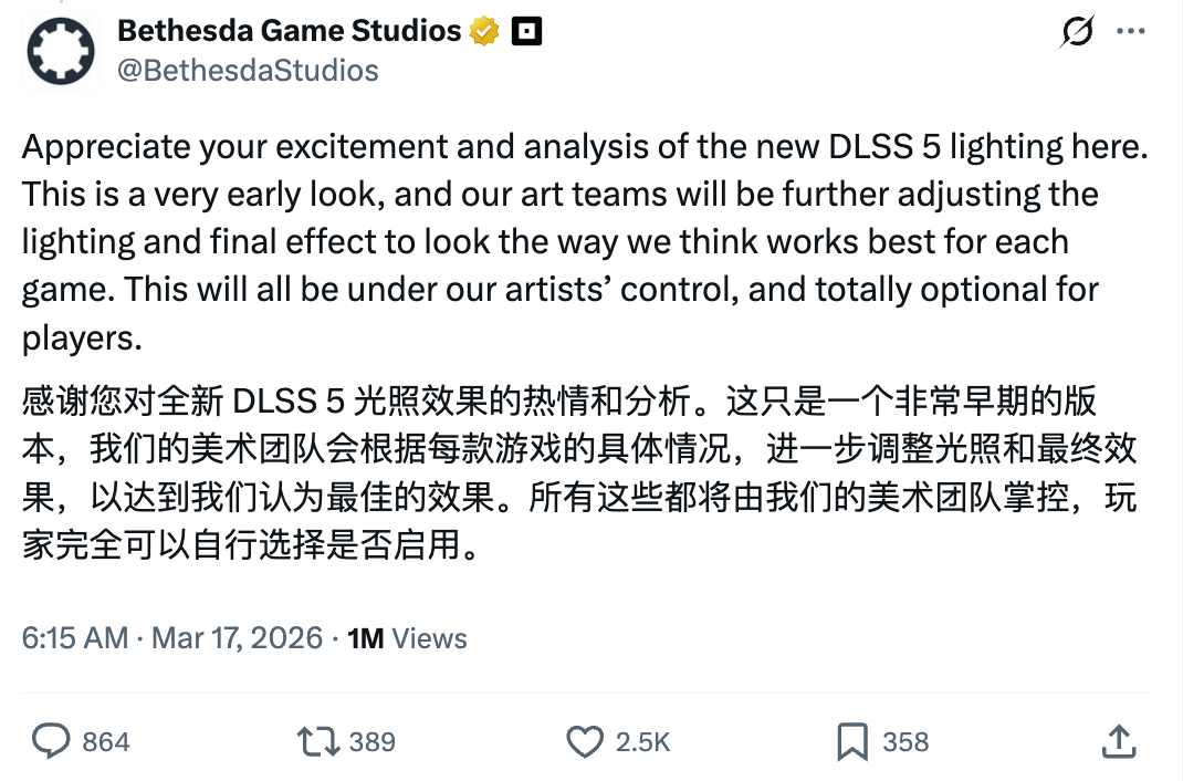 贝塞斯达则在评论区表示,即将登陆《星空》和《上古卷轴 4:湮没》重制版的DLSS 5支持完全由其美术人员掌控。