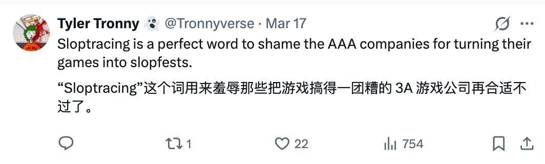 还有人造了个新词“Sloptracing”:把 AI slop(AI生成的低质内容)和 Ray Tracing(光线追踪)拼在一起,嘲讽这项技术又造出了不少slop。