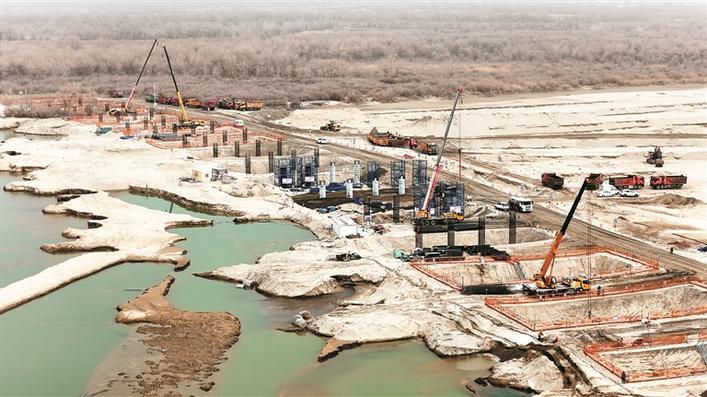 G217阿拉尔至图木舒克公路和田河特大桥施工现场(摄于3月17日)。G217阿拉尔至图木舒克公路项目是兵团重点交通项目,计划2028年7月完工。兵团日报全媒体记者 王志清 摄